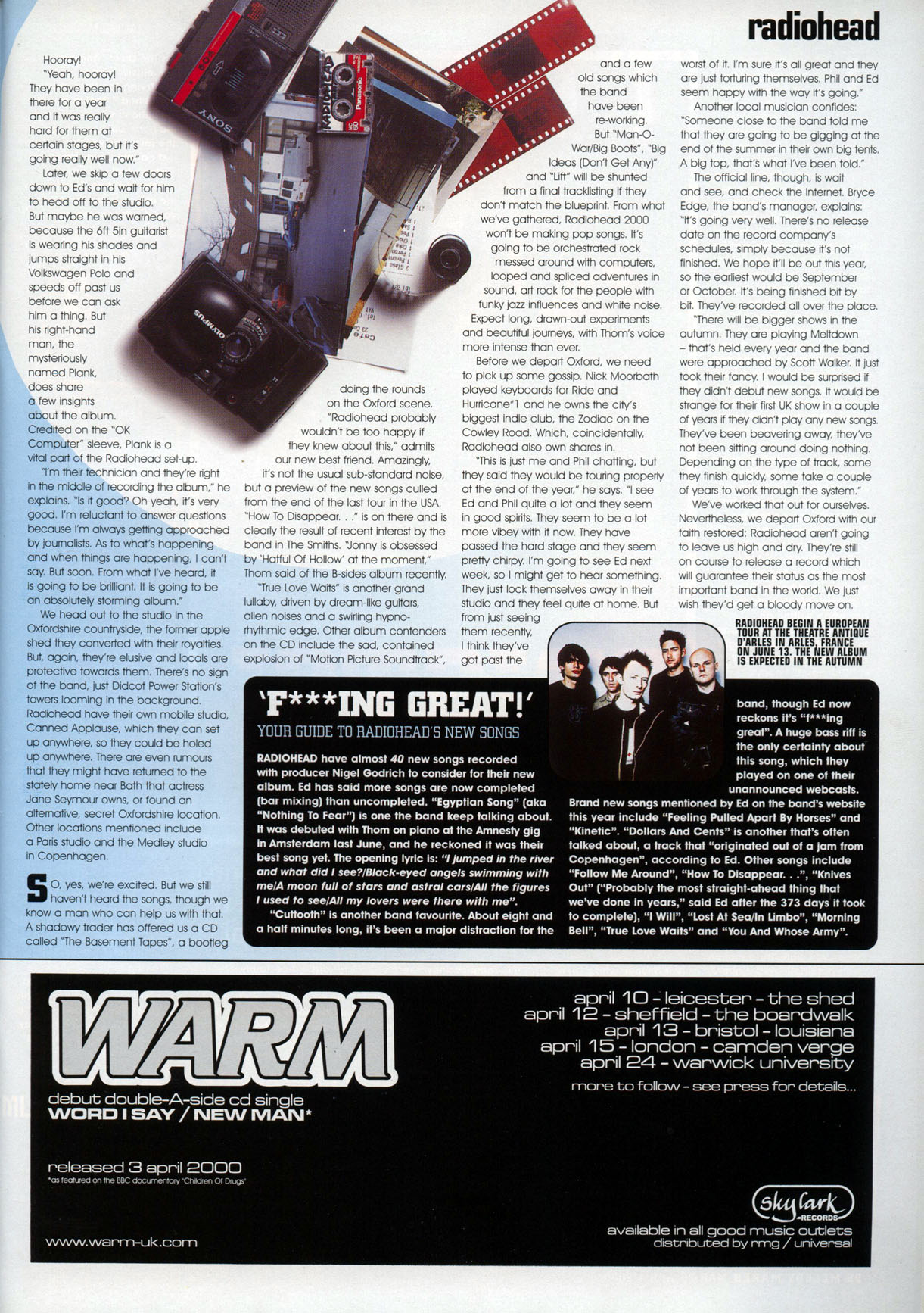 So, yes, we're excited. But we still haven't heard the songs, though we know a man who can help us with that. A shadowy trader has offered us a CD called "The Basement Tapes", a bootleg doing the rounds on the Oxford scene. "Radiohead probably wouldn't be too happy if they knew about this," admits our new best friend. Amazingly, it's not the usual sub-standard noise, but a preview of the new songs, culled from the end of the last tour in the USA. "How To Disappear..." is on there and is clearly the result of recent interest by the band in The Smiths. "Jonny is obsessed by 'Hatful Of Hollow' at the moment," Thom said of the B-sides album recently.