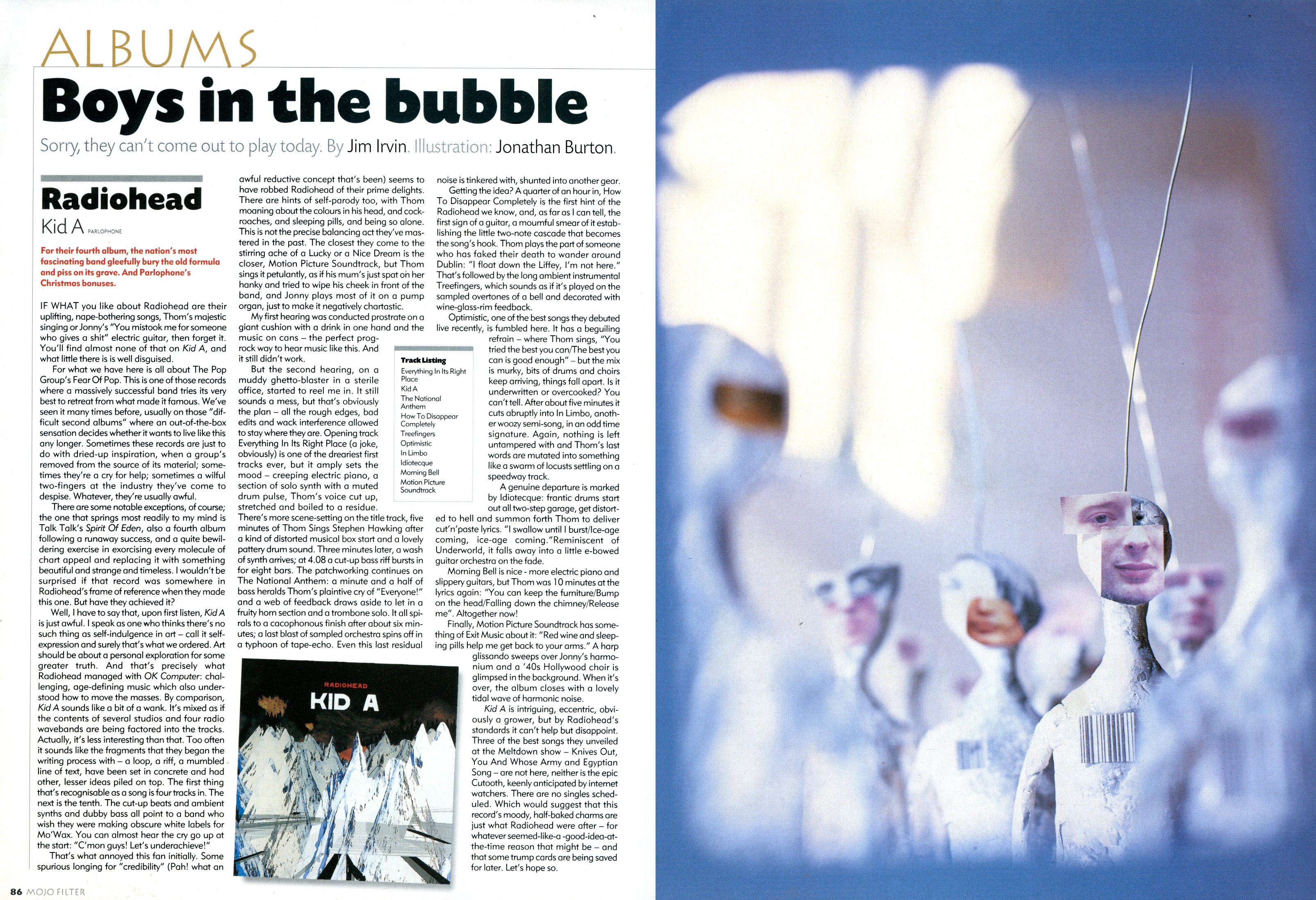 IF WHAT you like about Radiohead are their uplifting, nape-bothering songs, Thom’s majestic singing or Jonny’s “You mistook me for someone who gives a shit” electric guitar, then forget it. You’ll find almost none of that on Kid A, and what little there is is well disguised.