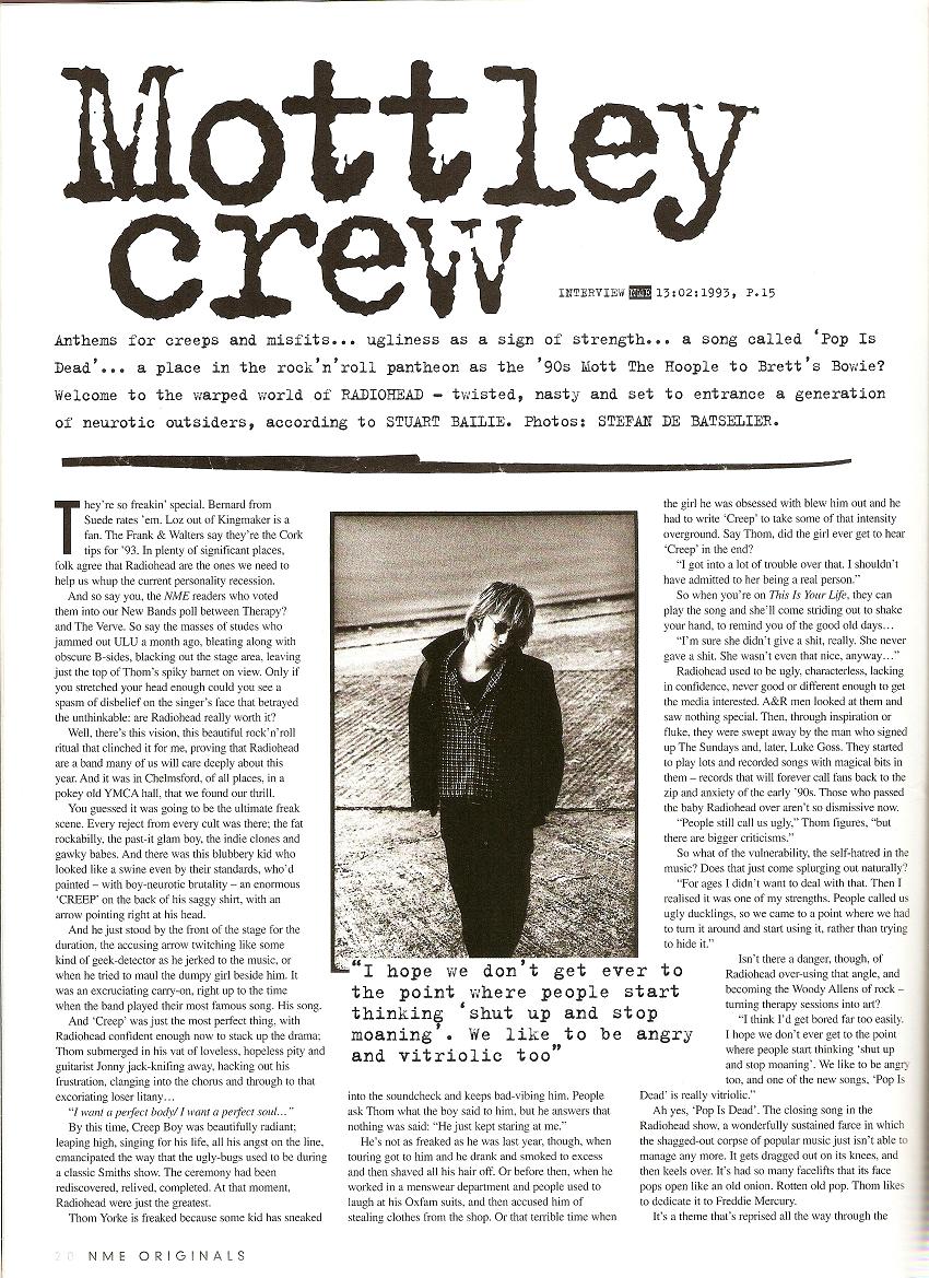 He's not as freaked as he was last year, though, when touring got to him and he drank and smoked to excess and then shaved all his hair off. Or before then, when he worked in a menswear department and people used to laugh at his Oxfam suits, and then accused him of stealing clothes from the shop. Or that terrible time when the girl he was obsessed with blew him out and he had to write “Creep” to take some of that intensity overground. Say Thom, did the girl ever get to hear “Creep” in the end?