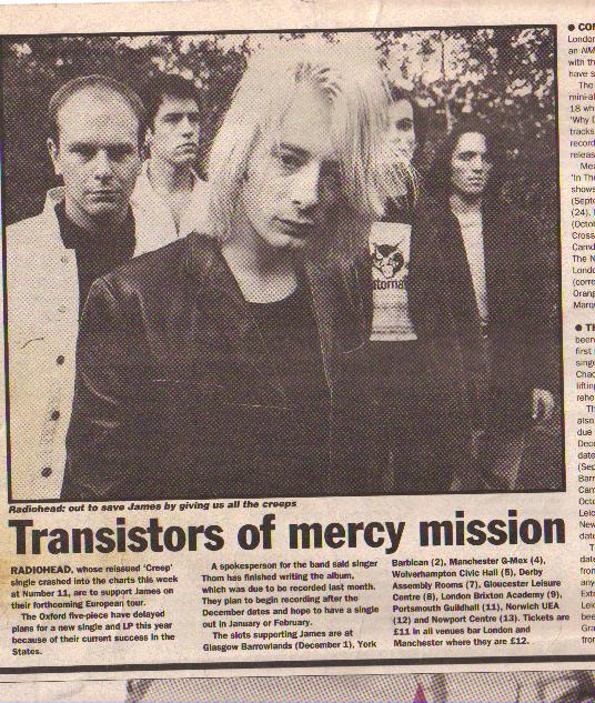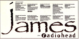 RADIOHEAD, whose reissued 'Creep' single crashed into the charts this week at Number 11, are to support James on their forthcoming European tour.
