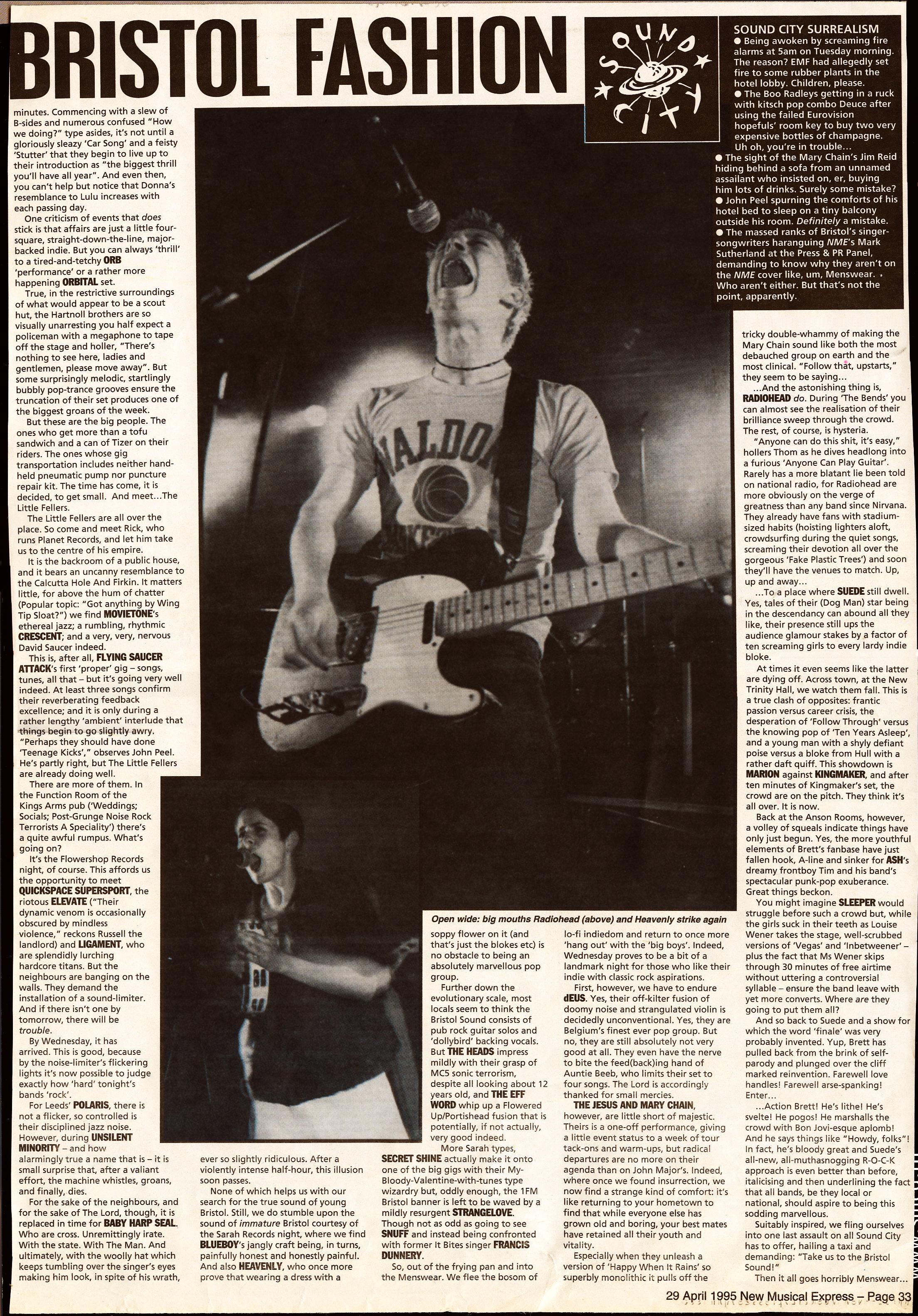 “Anyone can do this shit, it’s easy,” hollers Thom as he dives headlong into a furious ‘Anyone Can Play Guitar’. Rarely has a more blatant lie been told on national radio, for Radiohead are more obviously on the verge of greatness than any band since Nirvana. They already have fans with stadium-sized habits (hoisting lighters aloft, crowdsurfing during the quiet songs, screaming their devotion all over the gorgeous ‘Fake Plastic Trees’) and soon they’ll have the venues to match. Up, up and away…