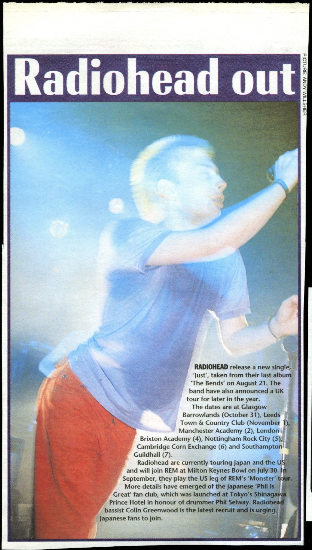 RADIOHEAD release a new single, ‘Just’, taken from their last album ‘The Bends’ on August 21. The band have also announced a UK tour for later in the year.