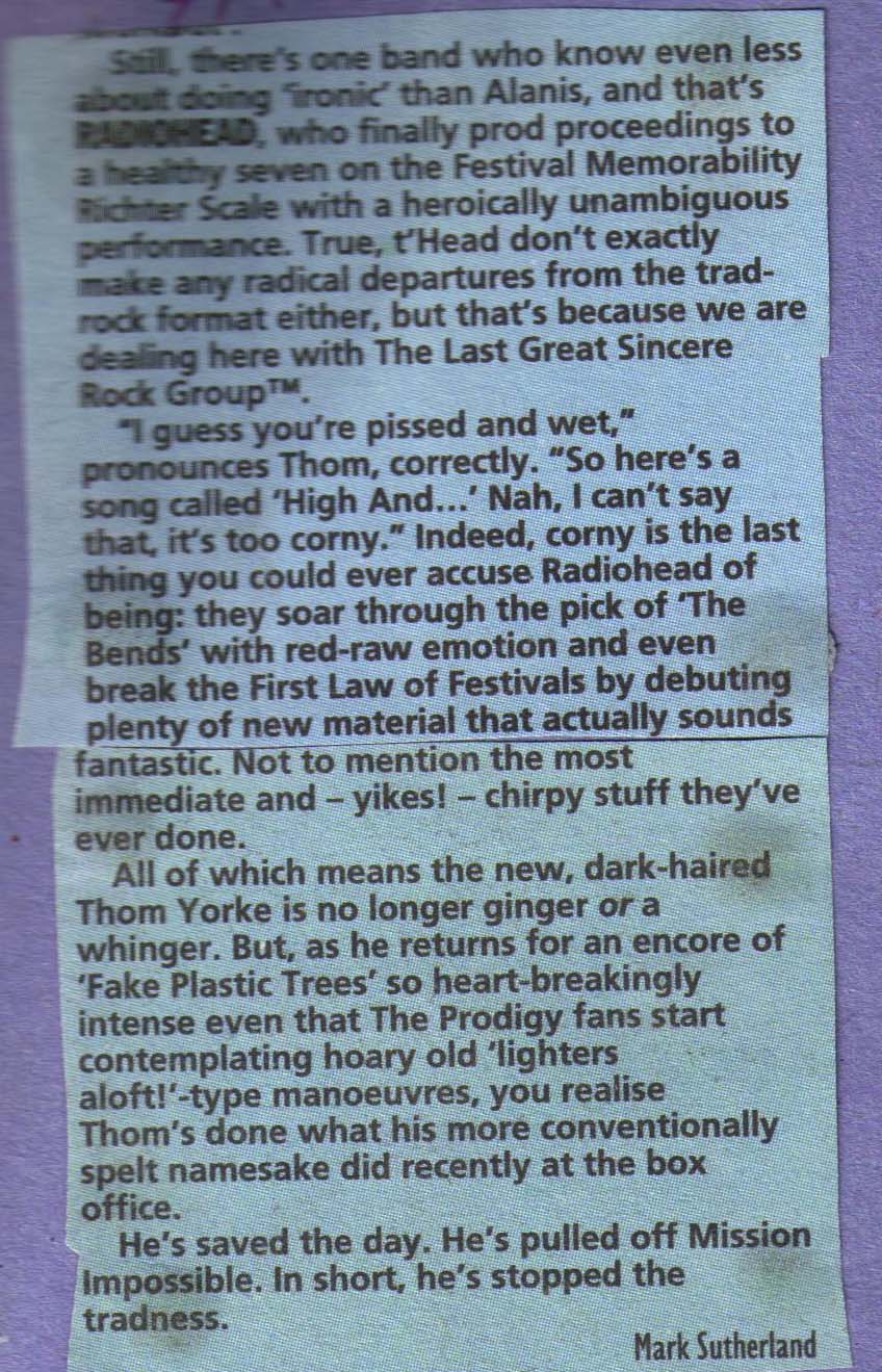 Still, there’s one band who know even less about doing ‘ironic’ than Alanis, and that’s RADIOHEAD, who finally prod proceedings to a healthy seven on the Festival Memorability Richter Scale with a heroically unambiguous performance. True, t’Head don’t exactly make any radical departures from the trad-rock format either, but that’s because we are dealing here with The Last Great Sincere Rock GroupTM.
