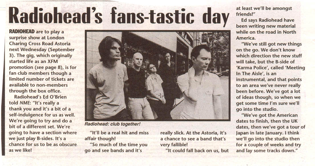 RADIOHEAD are to play a surprise show at London Charing Cross Road Astoria next Wednesday (September 3). The gig, which originally started life as an XFM promotion (see page 8), is for fan club members though a limited number of tickets are available to non-members through the box office.