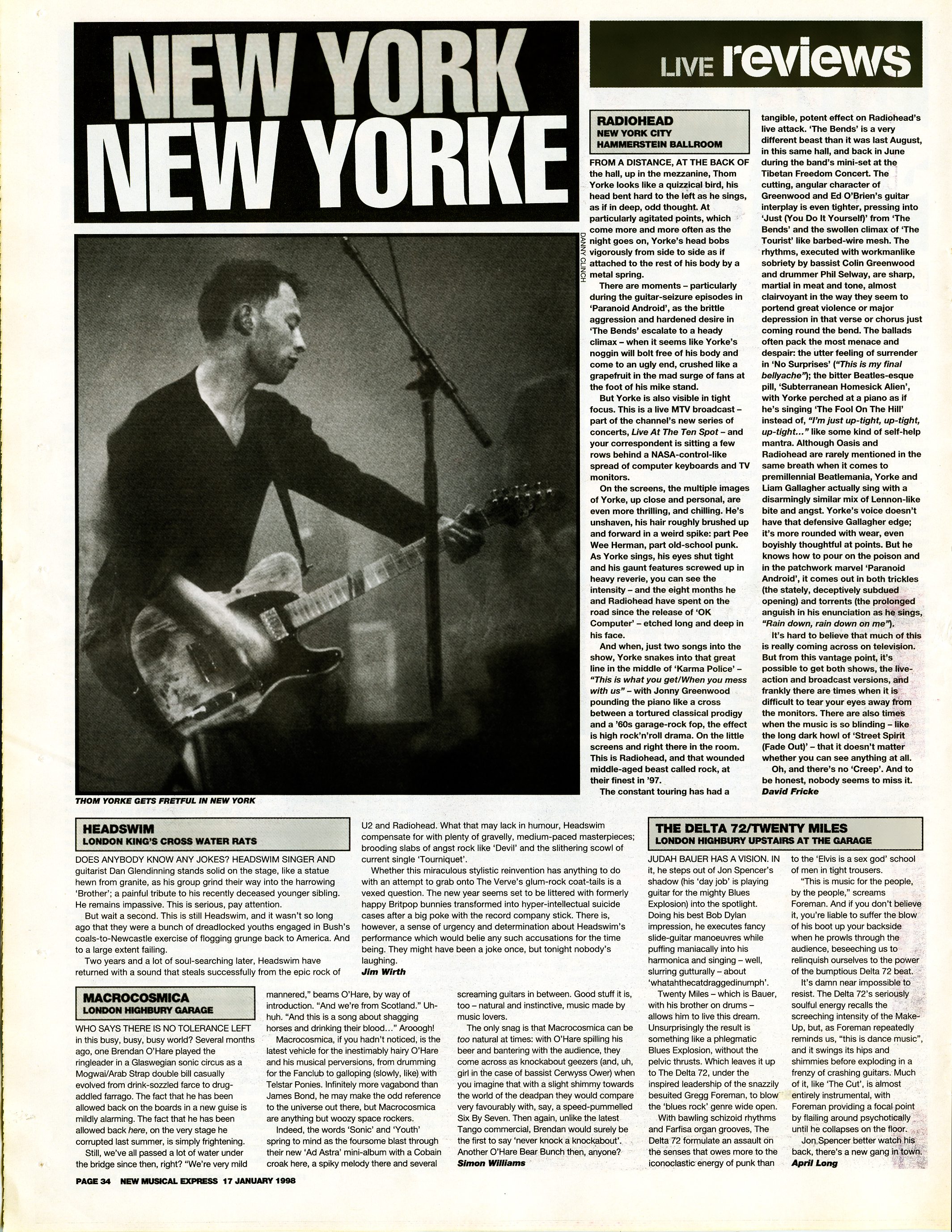 The constant touring has had a tangible, potent effect on Radiohead’s live attack. ‘The Bends’ is a very different beast than it was last August, in this same hall, and back in June during the band’s mini-set at the Tibetan Freedom Concert. The cutting, angular character of Greenwood and Ed O’Brien’s guitar interplay is even tighter, pressing into ‘Just (You Do It To Yourself)’ from ‘The Bends’ and the swollen climax of ‘The Tourist’ like barbed-wire mesh. The rhythms, executed with workmanlike sobriety by bassist Colin Greenwood and drummer Phil Selway, are sharp, martial in meat and tone, almost clairvoyant in the way they seem to portend great violence or major depression in that verse or chorus just coming round the bend. The ballads often pack the most menace and despair: the utter feeling of surrender in ‘No Surprises’ (“This is my final bellyache”); the bitter Beatles-esque pill, ‘Subterranean Homesick Alien’, with Yorke perched at a piano as if he’s singing ‘The Fool On The Hill’ instead of “I’m just up-tight, up-tight, up-tight...” like some kind of self-help mantra. Although Oasis and Radiohead are rarely mentioned in the same breath when it comes to premillennial Beatlesmania, Yorke and Liam Gallagher actually sing with a disarmingly similar mix of Lennon-like bite and angst. Yorke’s voice doesn’t have that defensive Gallagher edge; it’s more rounded with wear, even boyishly thoughtful at points. But he knows how to pour on the poison and in the patchwork marvel called ‘Paranoid Android’, it comes out in both trickles (the stately, deceptively subdued opening) and torrents (the prolonged anguish in his enunciation as he sings “Rain down, rain down on me”).