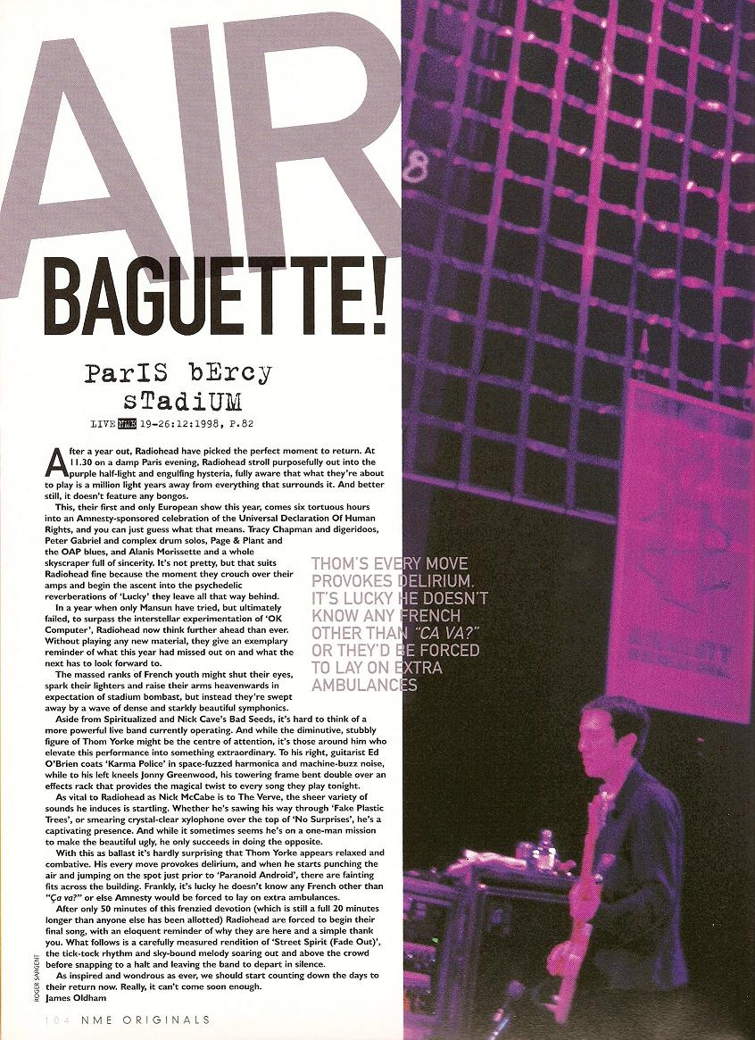 With this as ballast it’s hardly surprising that Thom Yorke appears relaxed and combative. His every move provokes delirium, and when he starts punching the air and jumping on the spot just prior to ‘Paranoid Android’, there are fainting fits across the building. Frankly, it’s lucky he doesn’t know any French other than “Ça va?” or else Amnesty would be forced to lay on extra ambulances.