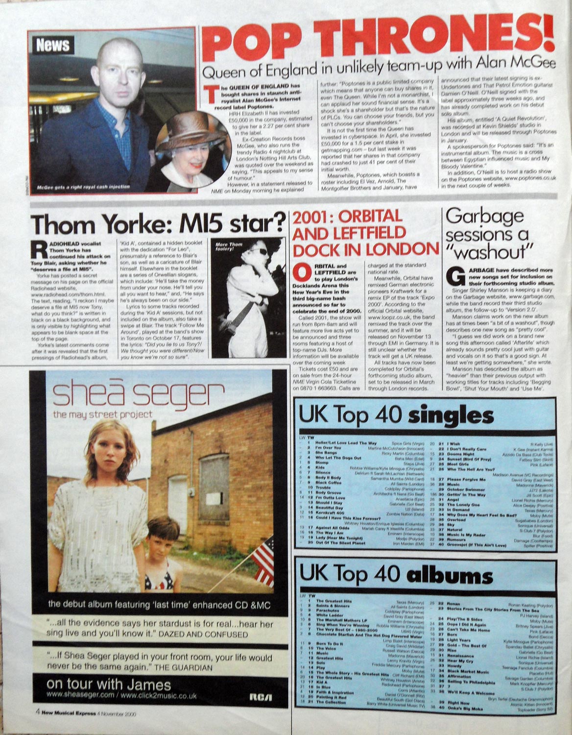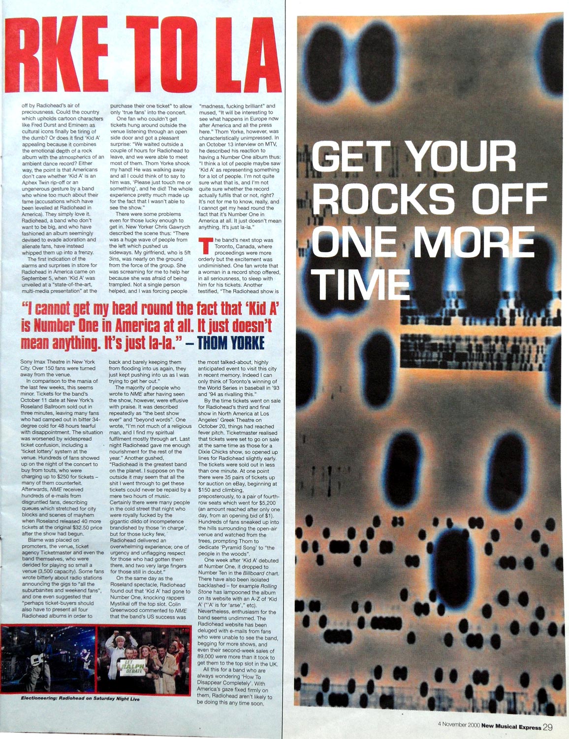 On the same day as the Roseland spectacle, Radiohead found out that “Kid A” had gone to Number One, knocking rappers Mystikal off the top slot. Colin Greenwood commented to NME that the band’s US success was “madness, fucking brilliant” and mused, “it will be interesting see what happens in Europe now after America and all the press here.” Thom Yorke, however, was characteristically unimpressed. In an October 13 interview on MTV, he described his reaction to having a Number One album thus: “I think a lot of people maybe saw “Kid A” as representing something for a lot of people. I’m not quite sure what that is, and I’m not quite sure whether the record actually fulfils that or not, right? It’s not for me to know, really, and I cannot get my head round the fact that it’s Number One in America at all. It just doesn’t mean anything. It’s just la-la.”
