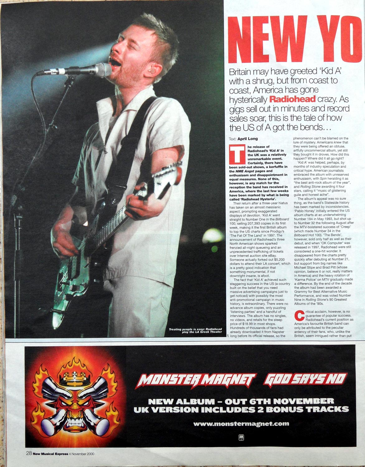 The release of Radiohead’s “Kid A” in the UK was a relatively unremarkable event. Certainly, there have been sold-out shows, a kerfuffle in the NME Angst pages and enthusiasm and disappointment in equal measures. None of this, however, is any match for the reception the band has received in America, where the last few weeks have been marked by what is being called “Radiohead Hysteria”.
