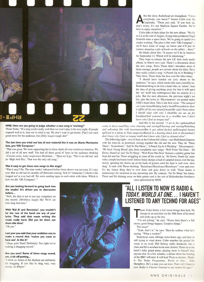 For the next three weeks then, Radiohead will travel around Portugal and Spain playing live. The plan is to try out 16 new songs they’ve written, find out which ones they like best, find out which ones the audiences like best and then go and record them. Easy. You wonder why, through the famously torturous recording sessions for The Bends and OK Computer, they made life so difficult for themselves (and, ho ho, with Kid A and Amnesiac, so difficult for us). But, as we’ll see, this is a whole new Radiohead we’re dealing with.