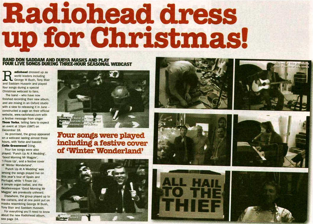 Radiohead dressed up as world leaders including George W Bush, Tony Blair and Saddam Hussein and played four songs during a special Christmas webcast to fans.