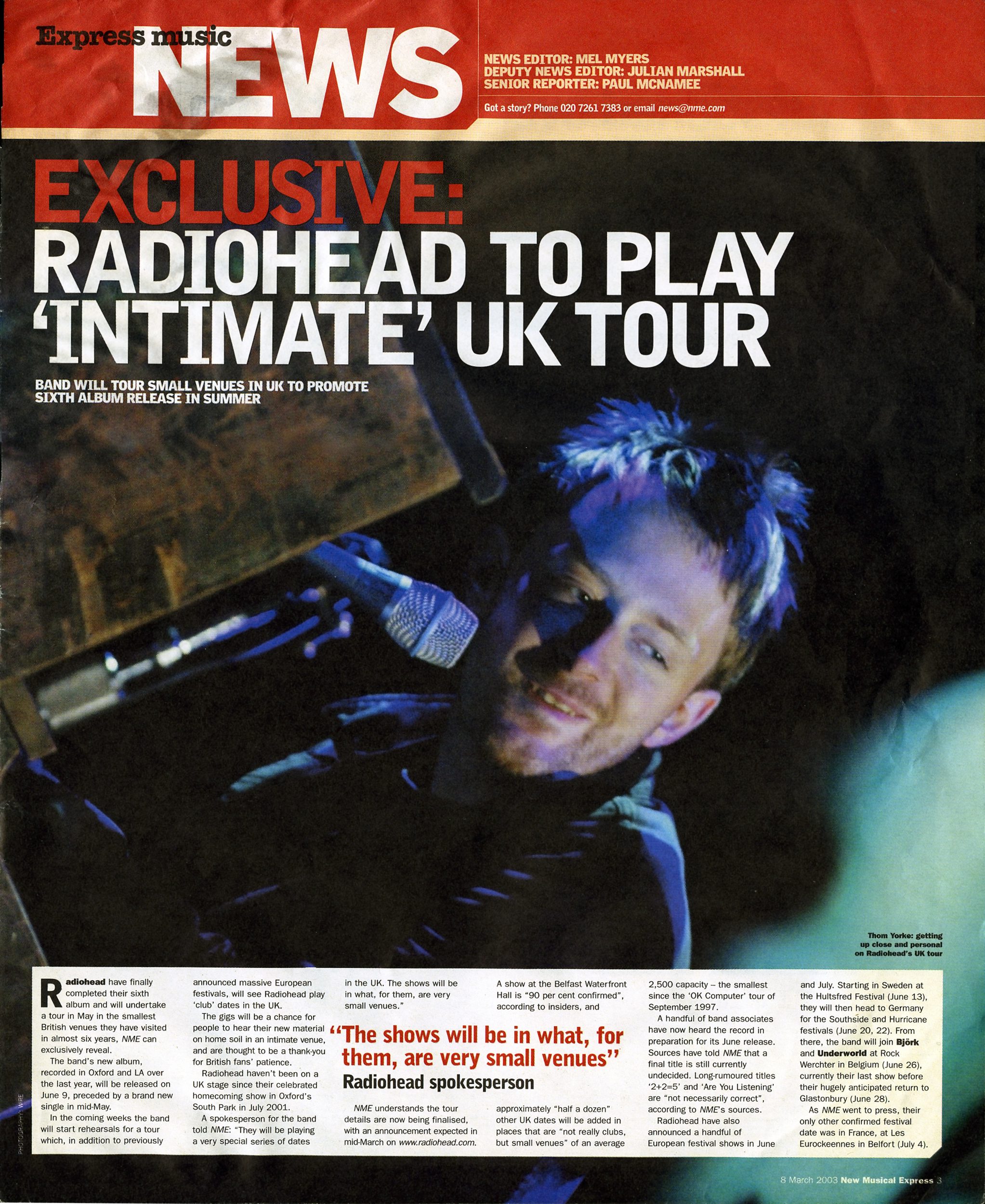 NME understands the tour details are now being finalised, with an announcement expected in mid-March on www.radiohead.com. A show at the Belfast Waterfront Hall is “90 per cent confirmed”, according to insiders, and approximately “half a dozen” other UK dates will be added in places that are “not really clubs, but small venues” of an average 2,500 capacity – the smallest since the 'OK Computer' tour of September 1997.