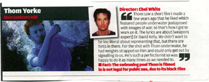 “Thom saw a short film I made a few years ago that he liked which featured people underwater juxtaposed with images of war, so that’s how I got to work on it. The lyrics are about [weapons expert] Dr David Kelly. We didn’t want to be too literal about representing that, but there are hints in there. For the shot with Thom underwater, he had weights strapped on him and could only get out by signalling to us. He’s such a perfectionist so was happy to do it as many times as we needed to.”