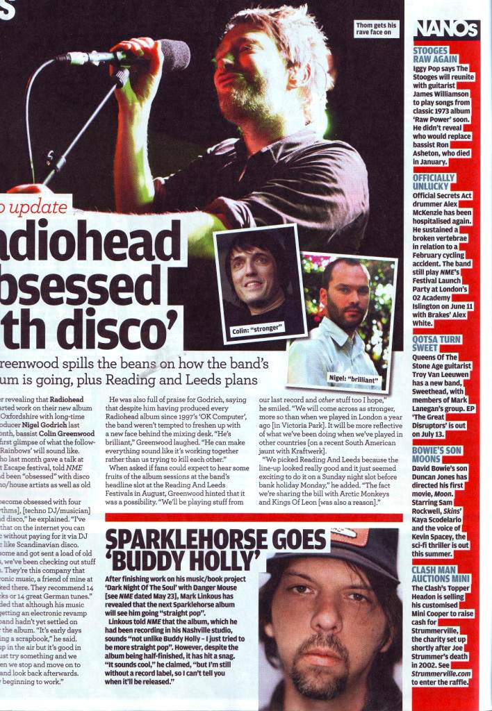 When asked if fans could expect to hear some fruits of the album sessions at the band's headline slot at the Reading and Leeds festivals in August, Greenwood hinted that it was a possibility. "We'll be playing stuff from our latest record and other stuff too I hope," he smiled. "We will come across stronger, more so than when we played in London a year ago [at Victoria Park]. It will be more reflective of what we've been doing when we've been playing in other countries [on a recent South American jaunt with Kraftwerk].