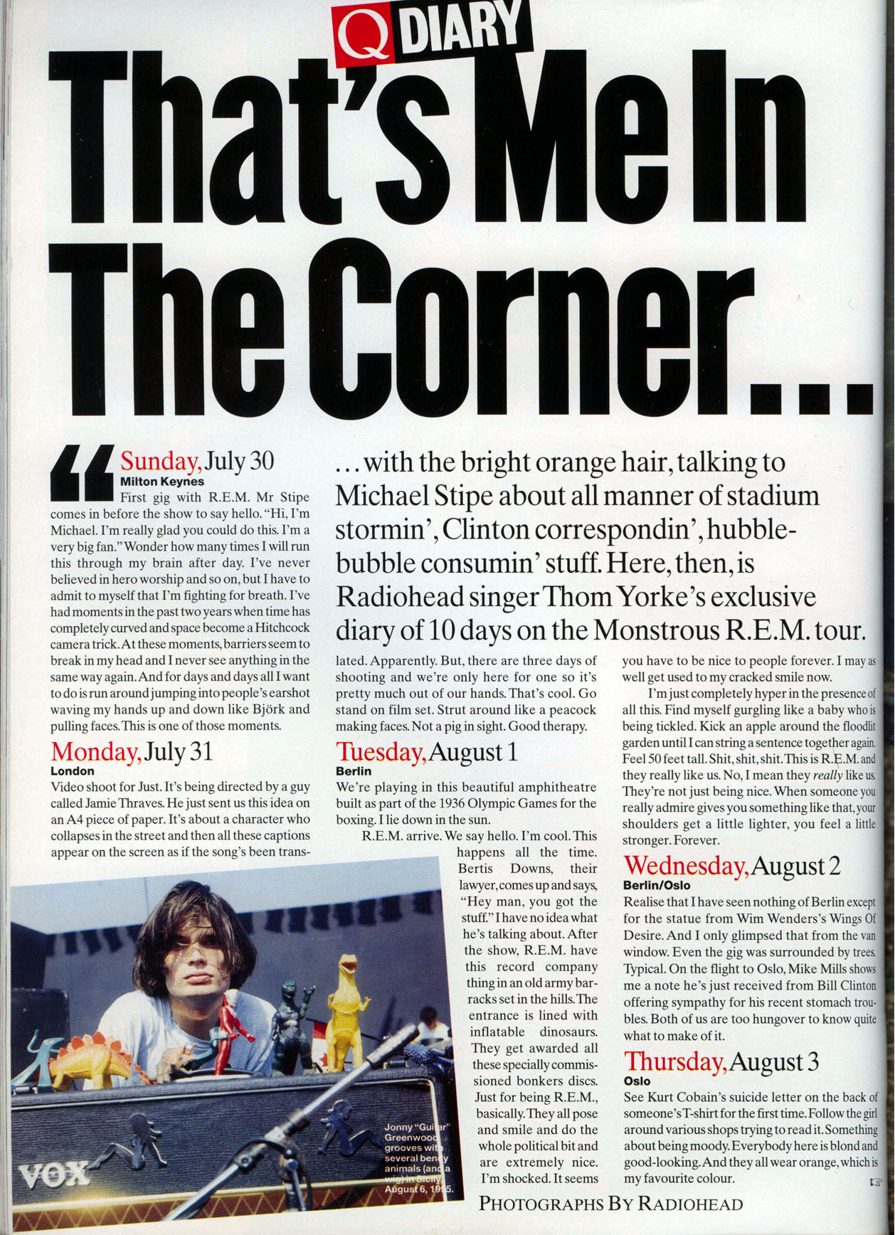 Realise that I have seen nothing of Berlin except for the statue from Wim Wender's Wings Of Desire. And I only glimpsed that from the van window. Even the gig was surrounded by trees. Typical. On the flight to Oslo, Mike Mills shows me a note he's just received from Bill Clinton offering sympathy for his recent stomach troubles. Both of us are too hungover to know quite what to make of it.
