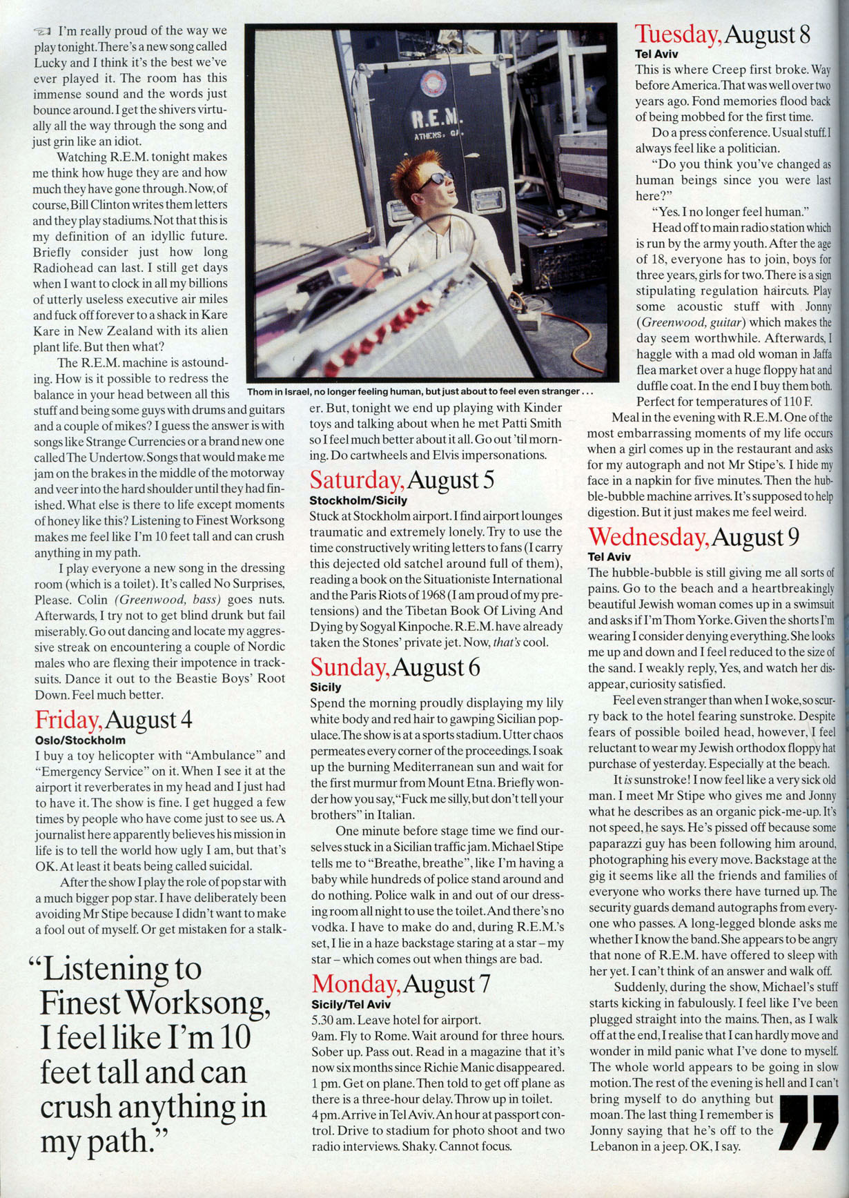 One minute before stage time we find ourselves stuck in a Sicilian traffic jam. Michael Stipe tells me to "Breathe, breathe", like I'm having a baby while hundreds of police stand around and do nothing. Police walk in and out of our dressing room all night to use the toilet. And there's no vodka. I have to make do and, during R.E.M.'s set, I lie in a haze backstage staring at a star - my star - which comes out when things are bad.
