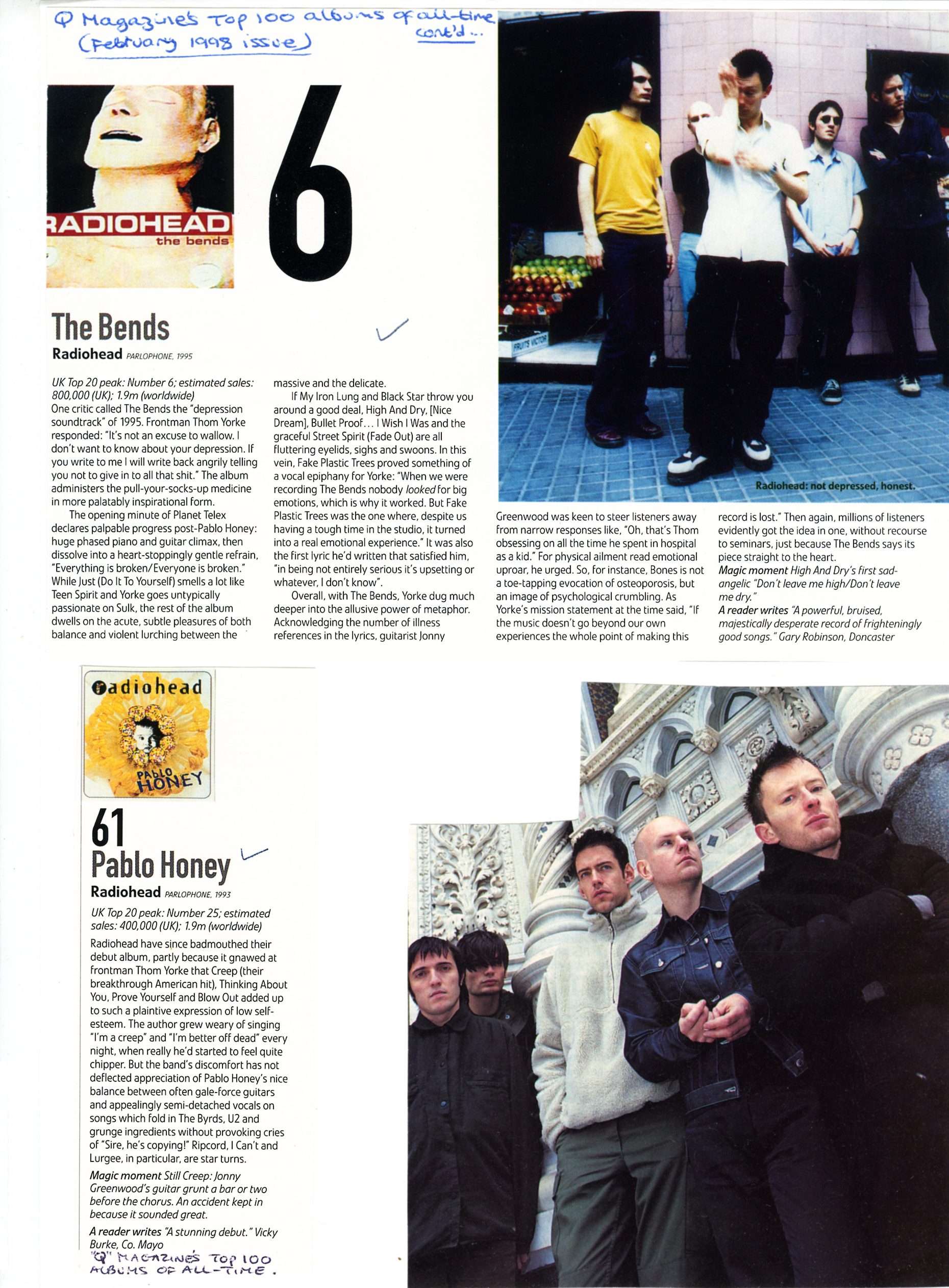 Overall, with The Bends, Yorke dug much deeper into the allusive power of metaphor. Acknowledging the number of illness references in the lyrics, guitarist Jonny Greenwood was keen to steer listeners away from narrow responses like, “Oh, that’s Thom obsessing on all the time he spent in hospital as a kid.” For physical ailment read emotional uproar, he urged. So, for instance, Bones is not a toe-tapping evocation of osteoporosis, but an image of psychological crumbling. As Yorke’s mission statement at the time said, “If the music doesn’t go beyond our own experiences the whole point of making this record is lost.” Then again, millions of listeners evidently got the idea in one, without recourse to seminars, just because The Bends says its piece straight to the heart.