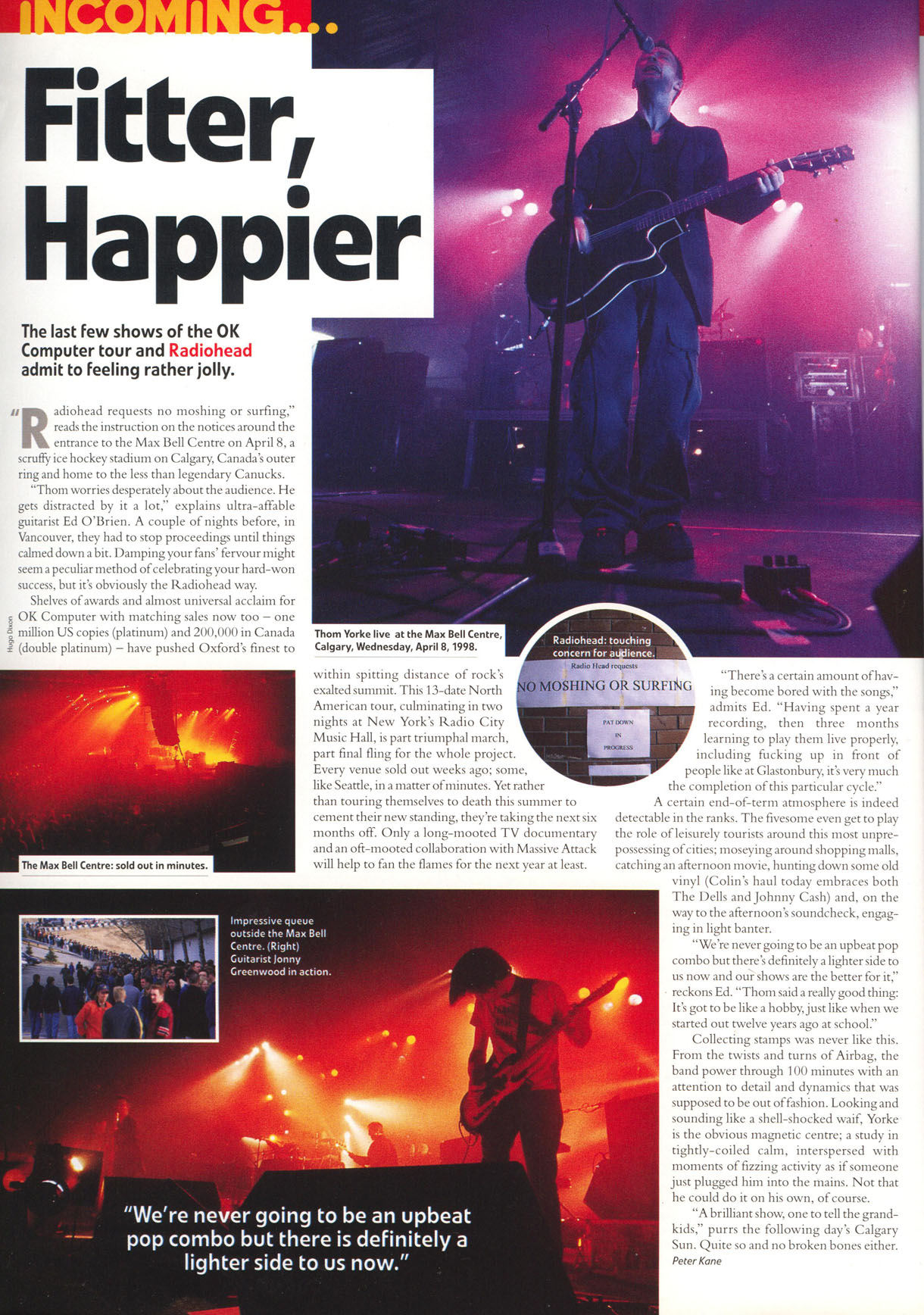 “Thom worries desperarte1y about the audience. He gets distracted by it a lot,” explains ultra-affable guitarist Ed O’Brien. A couple of nights before, in Vancouver, they had to stop proceedings until things calmed down a bit. Damping your fans’ fervour might seem a peculiar method of celebrating your hard-won success, but it’s obviously the Radiohead way.