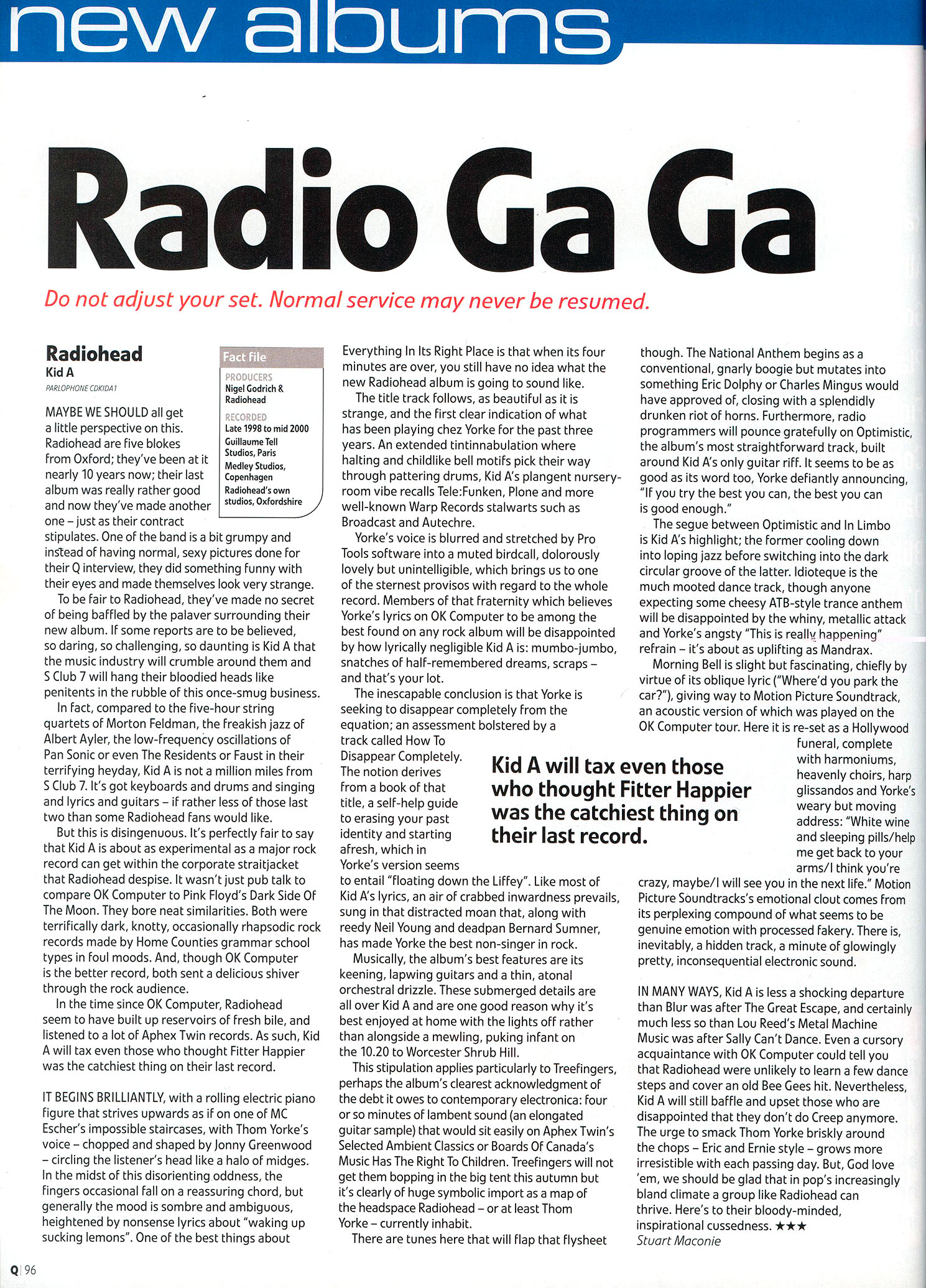 IN MANY WAYS, Kid A is less a shocking departure than Blur was after The Great Escape, and certainly much less so than Lou Reed's Metal Machine Music was after Sally Can't Dance. Even a cursory acquaintance with OK Computer could tell you that Radiohead were unlikely to learn a few dance steps and cover an old Bee Gees hit. Nevertheless, Kid A will still baffle and upset those who are disappointed that they don't do Creep anymore. The urge to smack Thom Yorke briskly around the chops – Eric and Ernie style – grows more irresistible with each passing day. But. God love 'em, we should be glad that in pop's increasingly bland climate a group like Radiohead can thrive. Here's to their bloody-minded, inspirational cussedness. *** (3 stars)