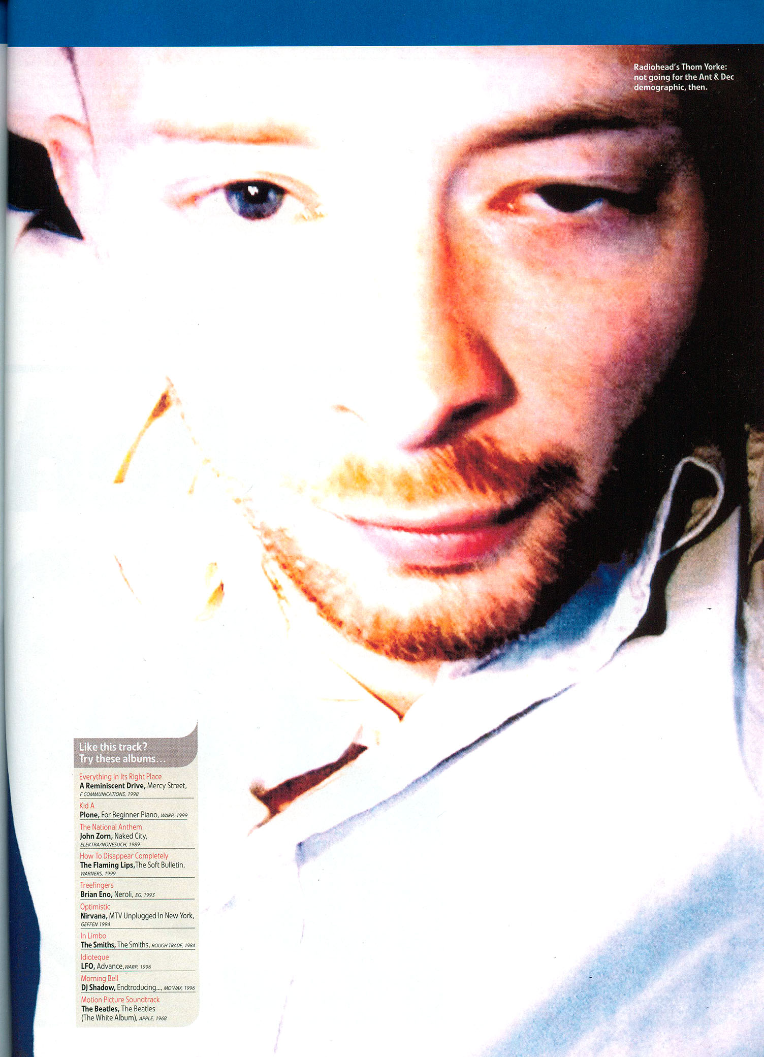 IT BEGINS BRILLIANTLY, with a rolling electric piano figure that strives upwards as if on one of MC Escher's impossible staircases, with Thom Yorke's voice – chopped and shaped by Jonny Greenwood – circling the listener's head like a halo of midges. In the midst of this disorienting oddness, the fingers occasional fall on a reassuring chord, but generally the mood is sombre and ambiguous, heightened by nonsense lyrics about “waking up sucking lemons”. One of the best things about Everything In Its Right Place is that when its four minutes are over, you still have no idea what the new Radiohead album is going to sound like.