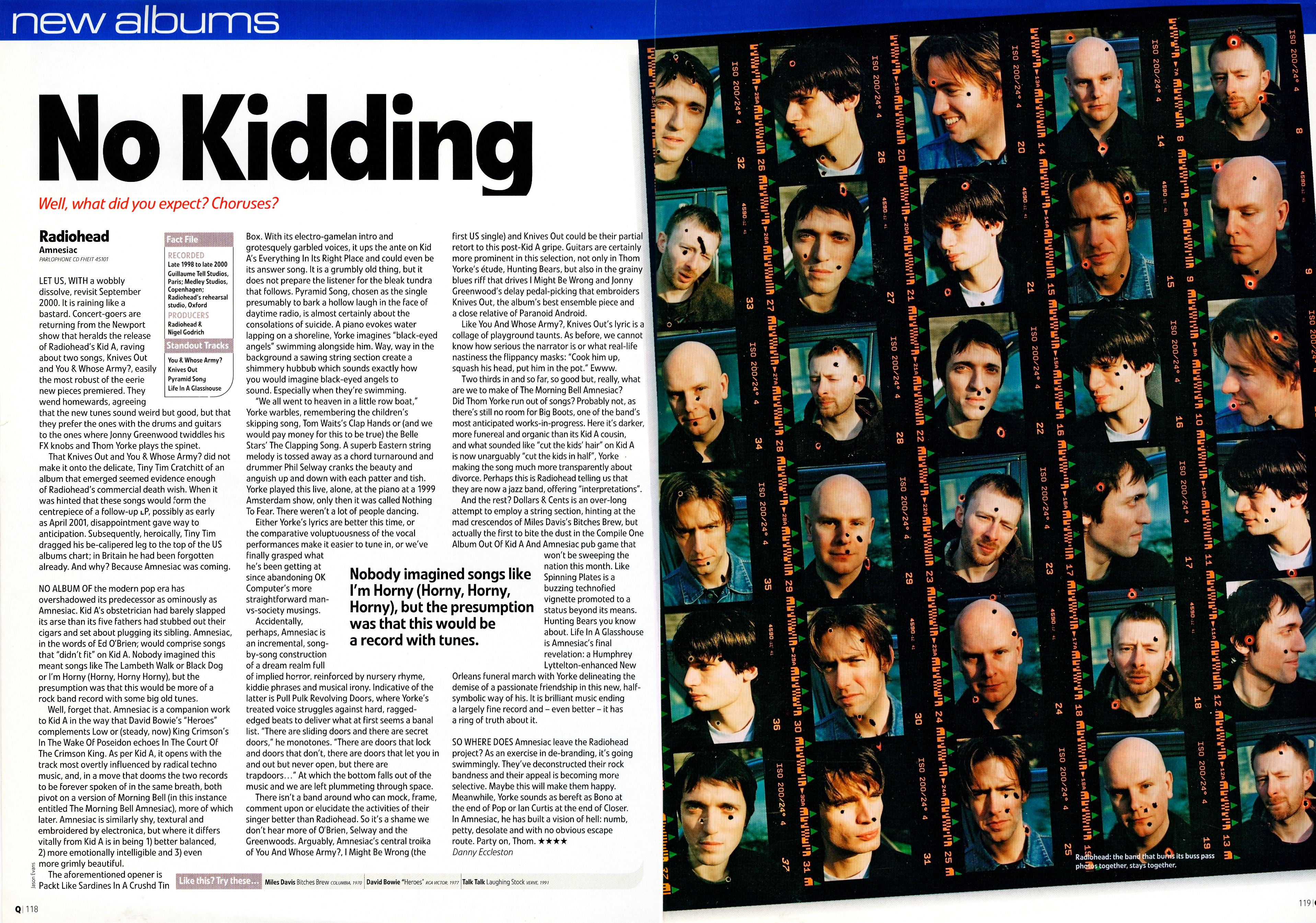 NO ALBUM OF the modern pop era has overshadowed its predecessor as ominously as Amnesiac. Kid A’s obstetrician had barely slapped its arse than its five fathers had stubbed out their cigars and set about plugging its sibling. Amnesiac, in the words of Ed O’Brien, would comprise songs that “didn’t fit” on Kid A. Nobody imagined this meant songs like The Lambeth Walk or Black Dog or I’m Horny (Horny, Horny Horny), but the presumption was that this would be more of a rock band record with some big old tunes.
