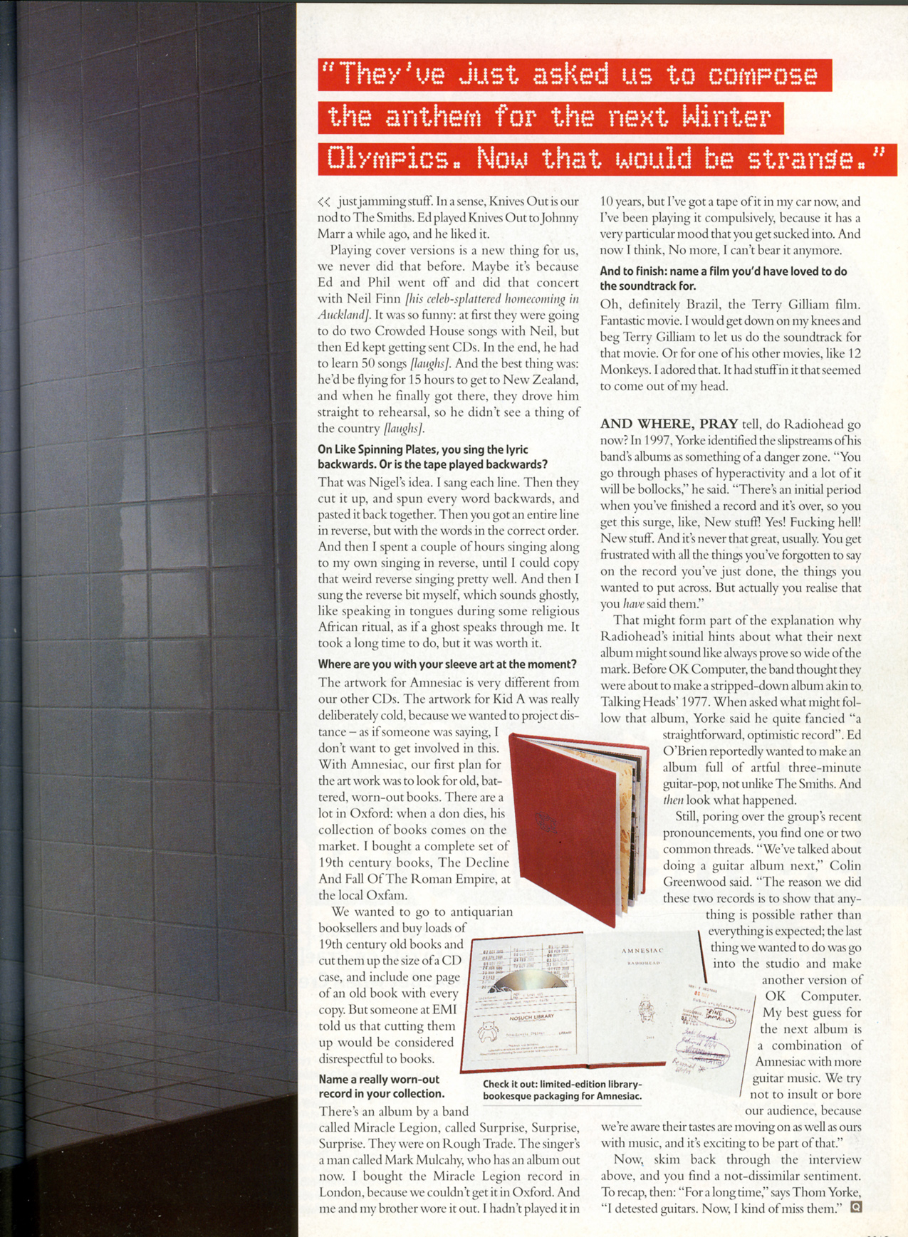 Why make the logical follow-up to OK Computer in a few months when you can go off your rocker for two years? Radiohead don't make things easy for themselves but now, with a new album, a new baby, and a clear head, Thom Yorke wants to talk. Kicking off a 20 page 'Head bonanza, rock's most innovative mind sits down for a very illuminating chat. “We went stark raving mad,” he tells Q.