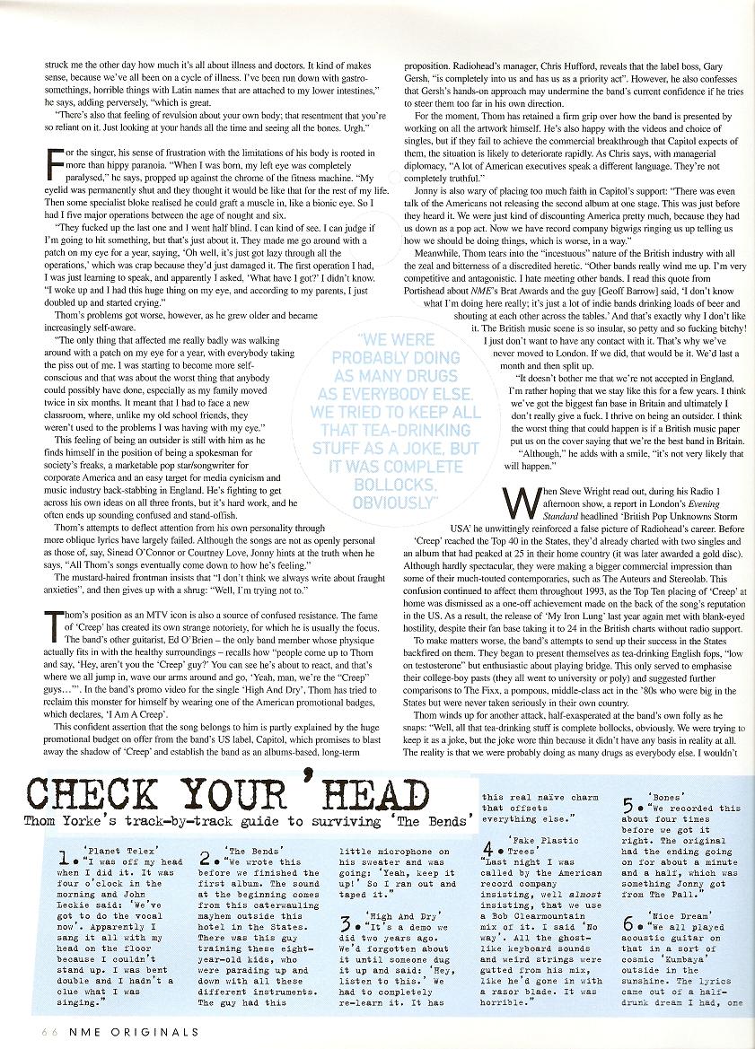 Radiohead are the awkward, ungainly misfits of the English music scene who express their insecurities with such force that, at their most extreme, they've touched a chord among the residents of Death Row. Thom shifts uneasily as he admits: "I don't want to set myself up like that again; I've had letters from Death Row, guys who have killed people, and they're responding to the lyrics on 'Creep'. That really fucking scared the hell out of me."