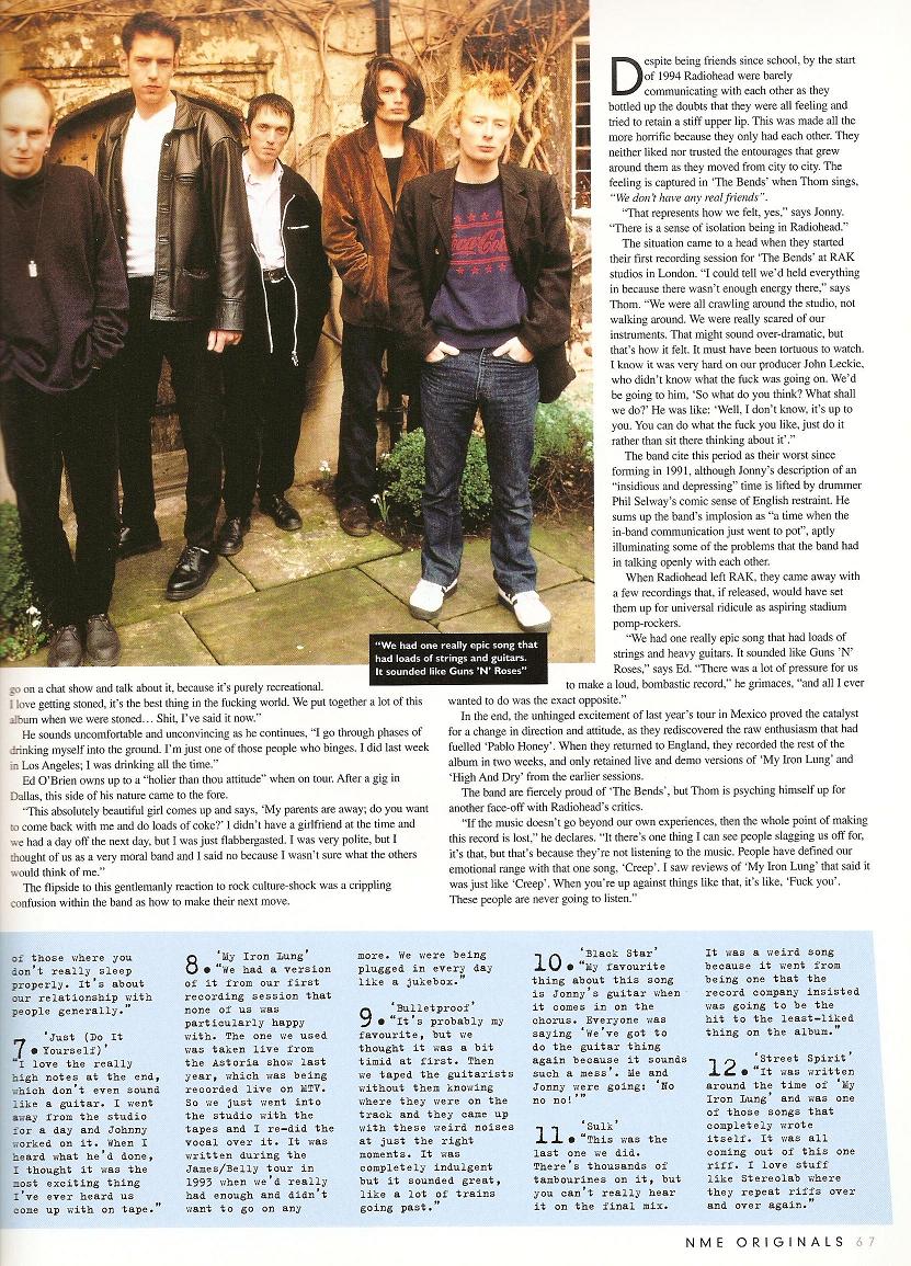 The situation came to a head when they started their first recording sessions for The Bends at RAK studios in London. "I could tell we'd held everything in because there wasn't enough energy there", says Thom. "We were all crawling around the studio, not walking around. We were really scared of our instruments. That might sound over-dramatic, but that's how it felt. It must have been tortuous to watch. I know it was very hard on our producer, John Leckie, who didn't know what the fuck was going on. We'd be gong to him: 'So what do you think? What shall we do?' He was like: 'Well, I don't know, it's up to you. You can do what the fuck you like, just do it rather than sit there thinking about it.'"