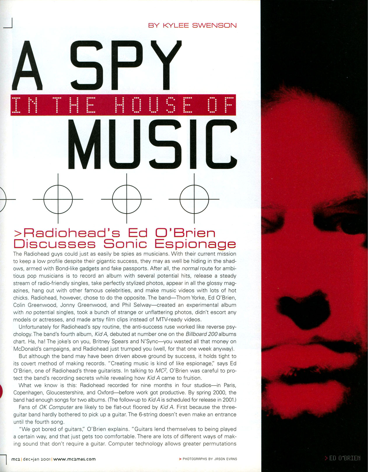 But although the band may have been driven above ground by success, it holds tight to its covert method of making records. "Creating music is kind of like espionage," says Ed O'Brien, one of Radiohead's three guitarists. In talking to MC", O'Brien was careful to protect the band's recording secrets while revealing how Kid A came to fruition.