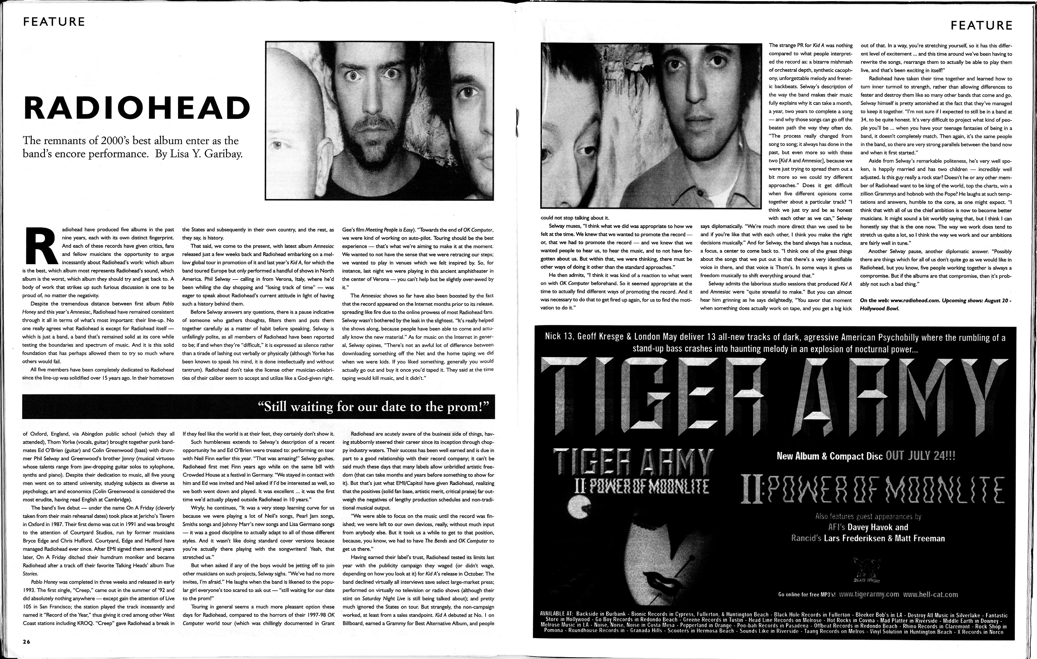 "The process really changed from song to song: it always has done in the past, but even more so with these two [Kid A and Amnesiac], because we were just trying to spread them out a bit more so we could try different approaches." Does it get difficult when five deferent opinions co me together about a particular track? "I think we just try and be as honest with each other as we can,'' Selway says diplomatically. “We're much more direct than we used to be and if you're like that with each other, I think you make the right decisions musically.'' And for Selway, the band always has a nucleus, a focus, a center to come back to. ''I think one of the great things about the songs that we put out is that there's a very identifiable voice in there, and that voice is Thom's. In some ways it gives us freedom musically to shift everything around that.”