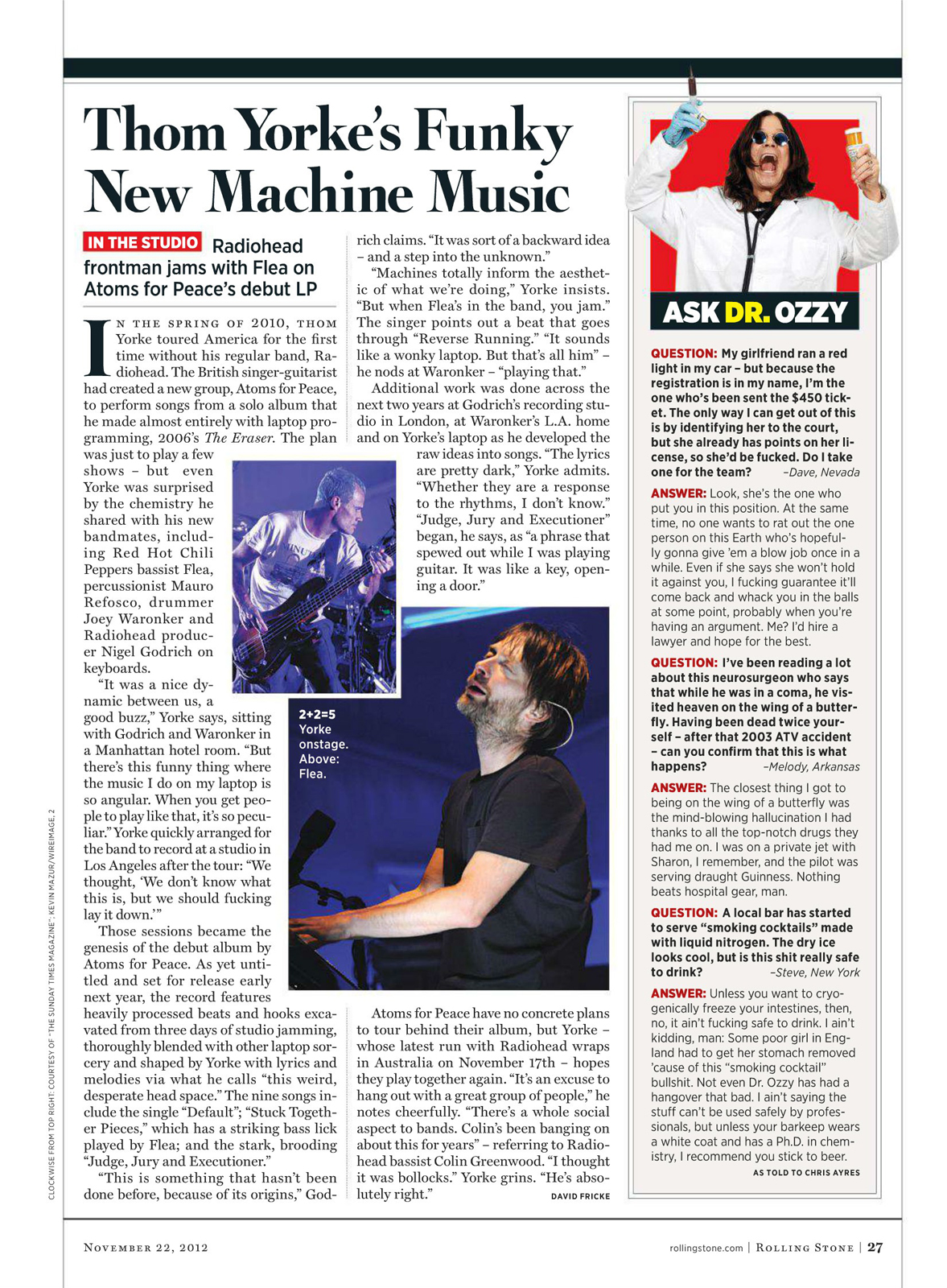 IN THE SPRING of 2010, Thom Yorke toured America for the first time without his regular band, Radiohead. The British singer-guitarist had created a new group, Atoms for Peace, to perform songs from a solo album that he made almost entirely with laptop programming, 2006's The Eraser. The plan was just to play a few shows - but even Yorke was surprised by the chemistry he shared with his new bandmates, incluing Red Hot Chili Peppers bassist Flea, percussionist Mauro Refoseo, drummer Joey Waronker and Radiohead producer Nigel Godrich on keyboards.
