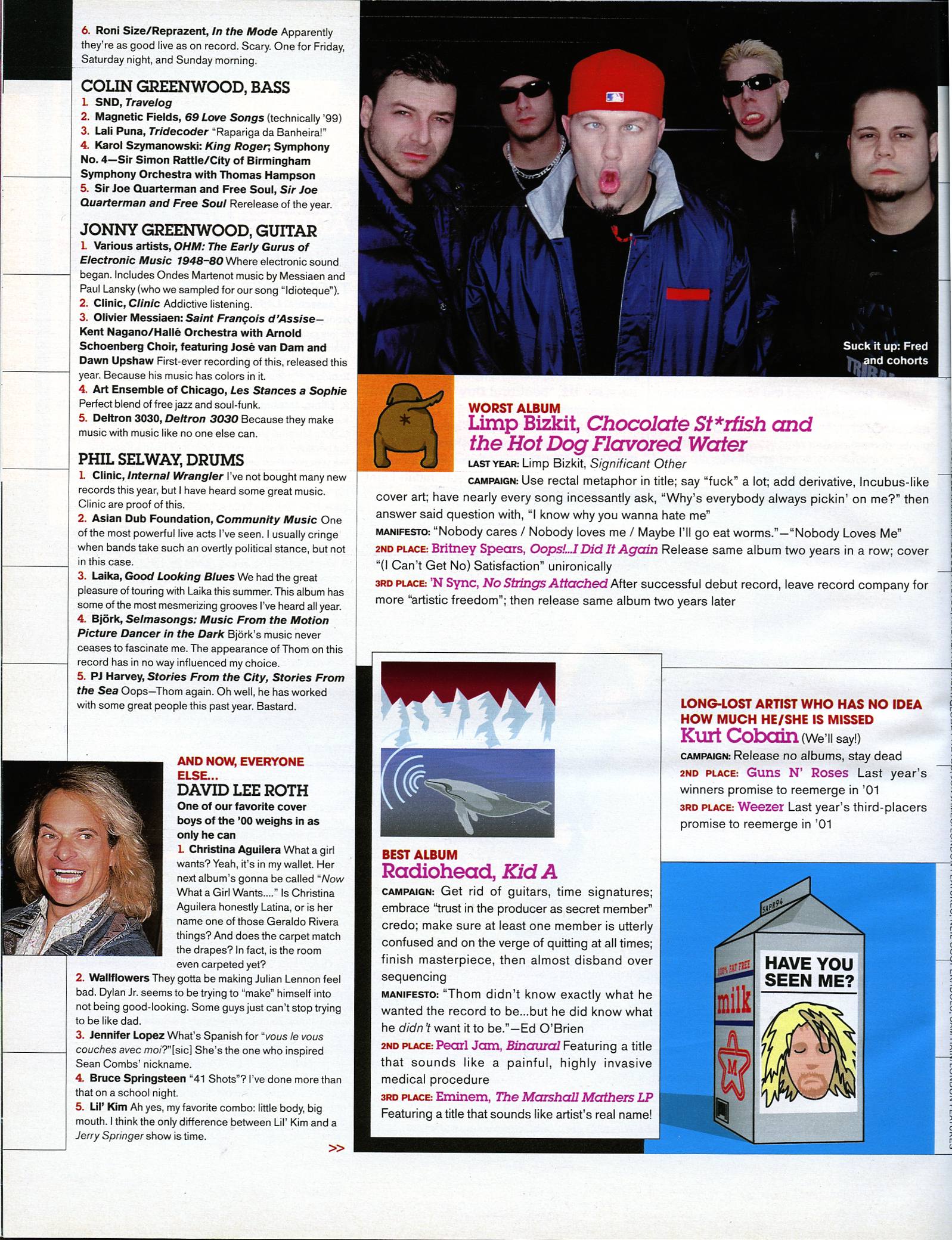 Radiohead win nearly everything but the mean stuff (Fred sweeps those). You can't take Britney, but you'd do her. You love and hate Eminem, and you'd like to see Florida secede from the union. And, as always, you've got beef with us.
