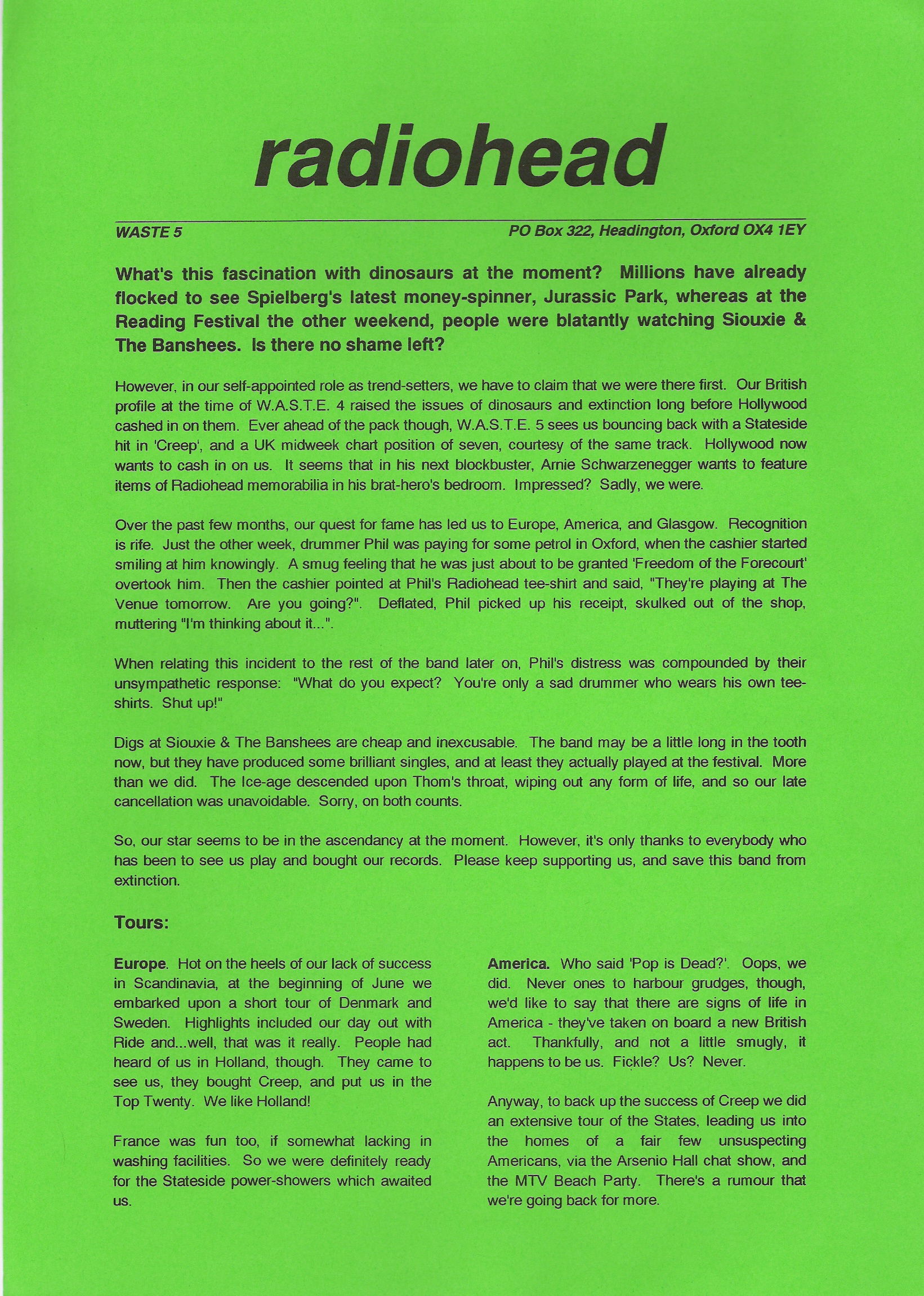 However, in our self-appointed role as trend-setters, we have to claim that we were there first. Our British profile at the time of W.A.S.T.E. 4 raised the issues of dinosaurs and extinction long before Hollywood cashed in on them. Ever ahead of the pack though, W.A.S.T.E. 5 sees us bouncing back with a Stateside hit in ‘Creep’, and a UK midweek chart position of seven, courtesy of the same track. Hollywood now wants to cash in on us. It seems that in his next blockbuster, Arnie Schwarzenegger wants to feature items of Radiohead memorabilia in his brat-hero’s bedroom. Impressed? Sadly, we were.