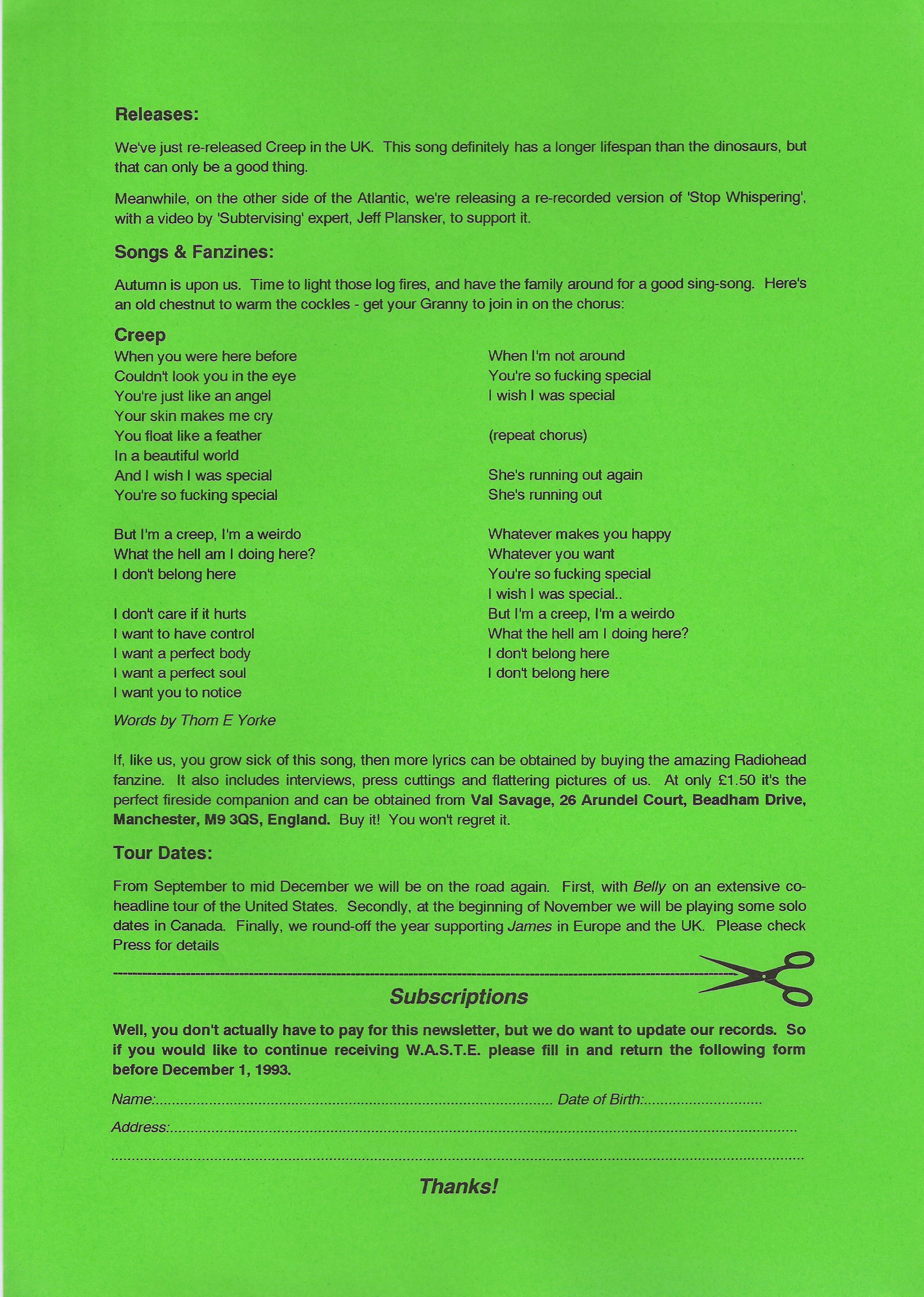 If, like us, you grow sick of this song, then more Lyrics can be obtained by buying the amazing Radiohead fanzine. It also includes interviews, press cuttings and flattering pictures of us. At only £1.50 it’s the perfect fireside companion and can be obtained from