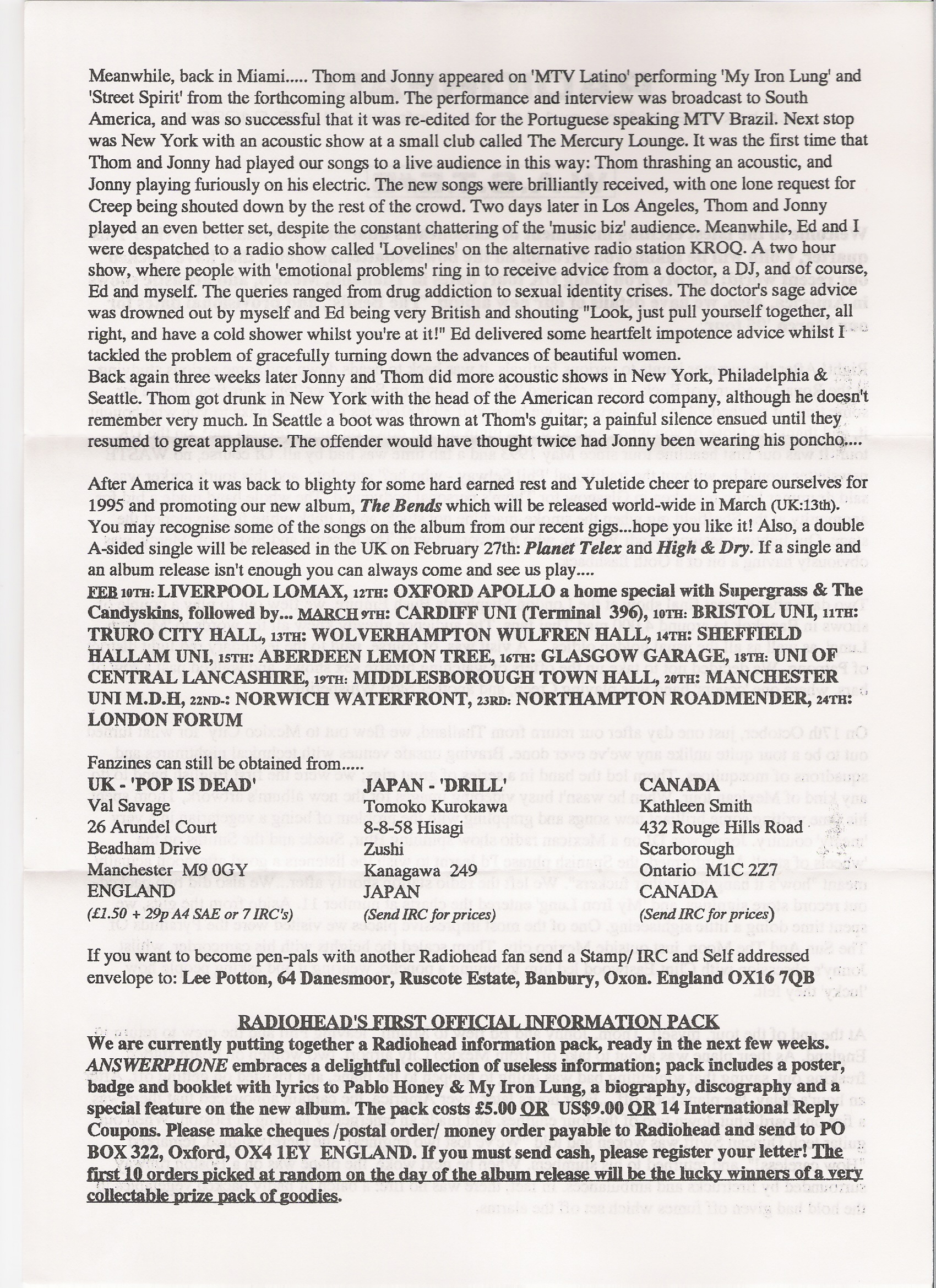 Welcome to the latest exciting instalment of Radiohead’s quarterly information service! This quarter, Colin will be taking you through all the bowel-shattering events that have ‘rocked’ our recent world: the My Iron Lung UK tour, dates in Thailand, Mexico, and acoustic shows in America. Also, we have details of our new album, ‘The Bends’, and provisional dates for our March ‘95 tour.