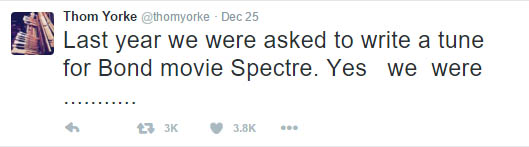 Spectre was released in the UK on October 26th 2015, with a theme song by Sam Smith called 'Writing's On the Wall'. For two months after that it was still unclear if Radiohead had actually produced a theme song of their own, or whether the rumours from the period leading up to the film's release had been unfounded. They were not, as was shown when Radiohead in a surprising move released their rejected (or withdrawn) Spectre theme song on December 25th 2015 as a download-only single on Soundcloud: