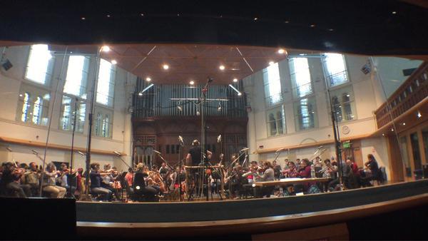 There are currently no details available regarding the sessions for this song, but it is highly likely that the strings were recorded at a session at AIR studios in London. Conducter Robert Ziegler had posted three photos from that session, which also show Thom, Jonny, Ed and Nigel, to his social media accounts in early September 2015, but deleted them a short while later, possibly at the request of the band, who wanted to avoid premature speculation about them doing the new Bond song. Such speculation went around already, and was indeed fuelled by these images (click to enlarge):