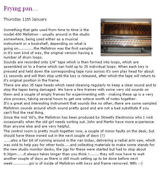 On january 11th 2007, Plank posted a picture of a mellotron on his blog on stringsreunited.com. This instrument was used during the recording of the song: